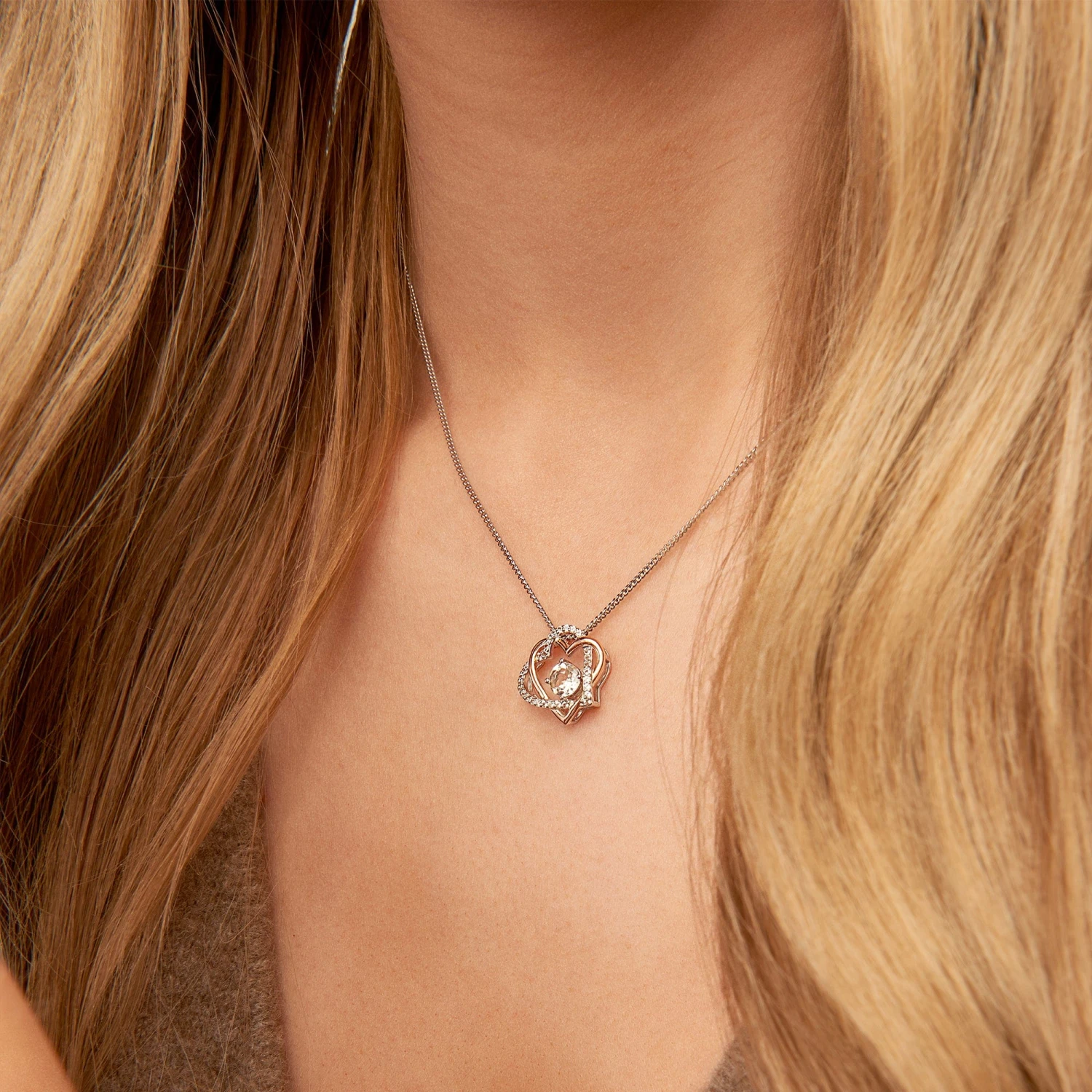 Our timeless Always in My Heart Silver Pendant features two hearts entwined in everlasting love. Carefully crafted in sterling silver and 9ct rose gold, the earrings are given extra sparkle with the addition of round faceted white topaz gemstones. Show them you’ll never part with this endlessly romantic gift.