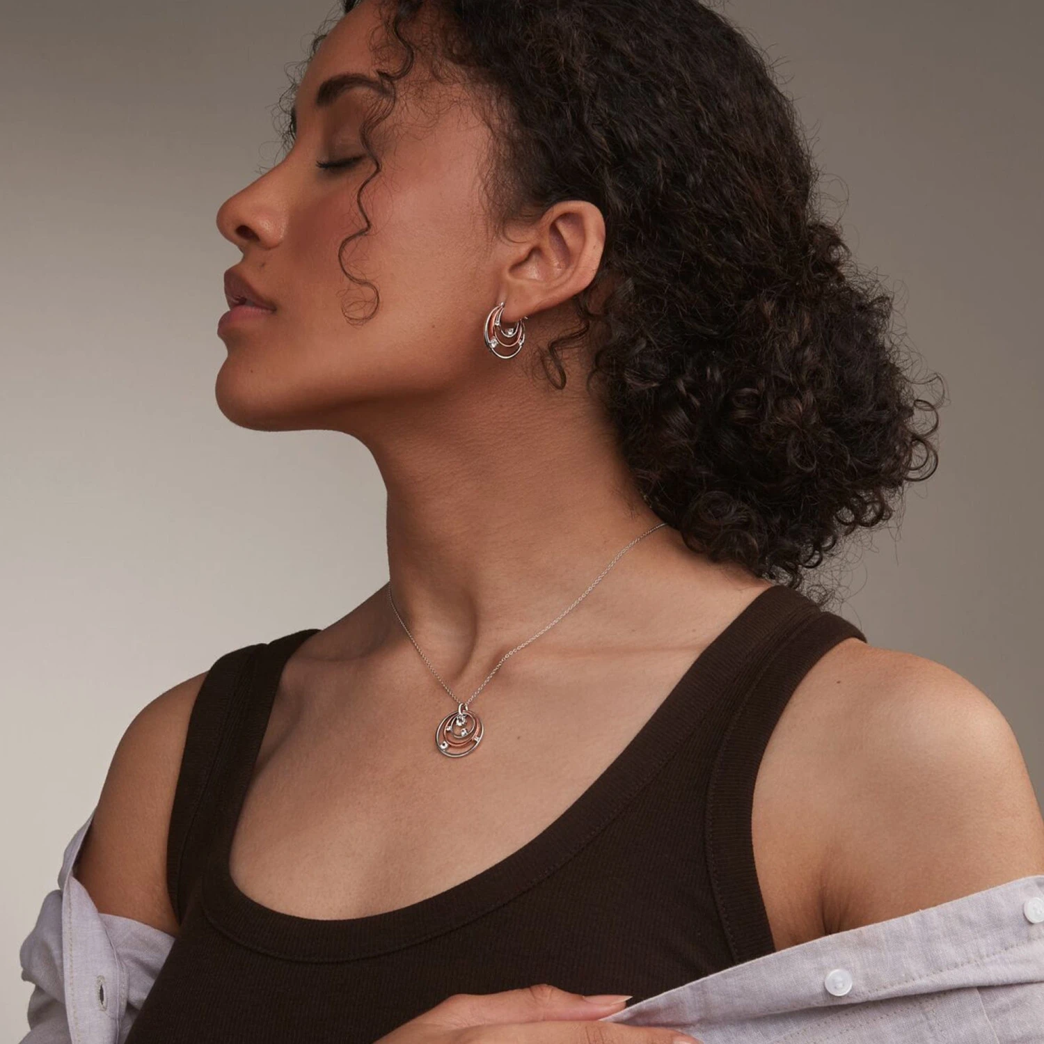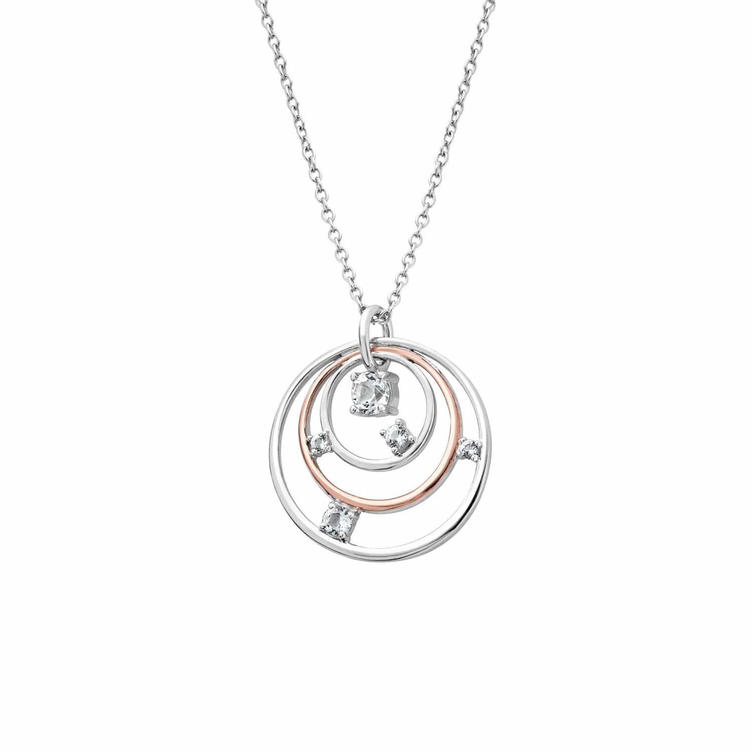 Our gorgeous Awyr Y Nos Silver Pendant features rings of sterling silver and 9ct rose gold tracing the orbits of genuine round faceted white topaz gemstone planets around a central sun-like stone. Named after the Welsh for “night sky”, this heavenly pendant will be the shining star of any outfit.