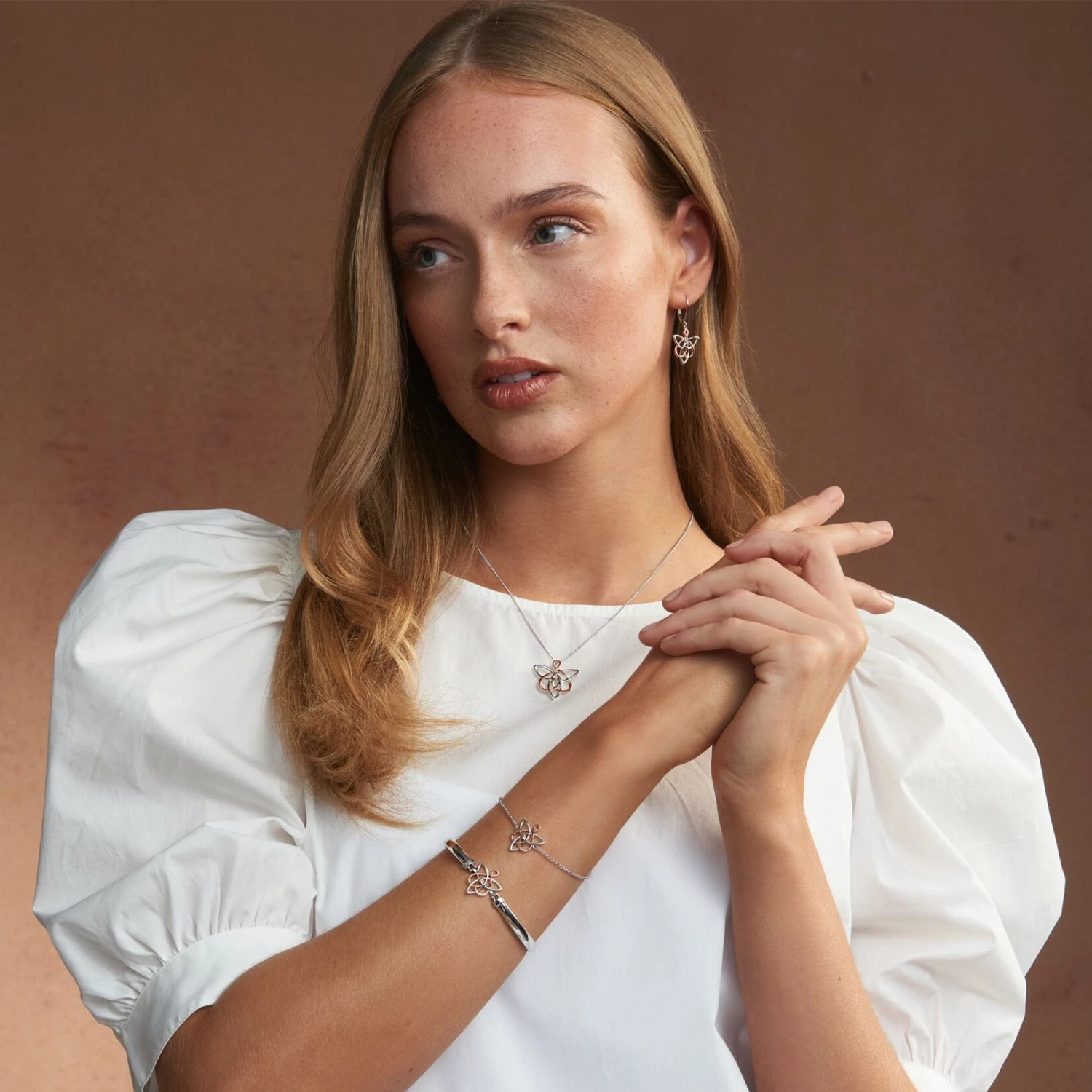 Spark your imagination and add a sprinkle of enchantment to life with this beautiful Fairies of the Mine Silver Bangle, which recalls the mythical little people said to inhabit the grounds of the Clogau St David’s gold mine. Interlocking patterns of sterling silver and 9ct rose gold weave their magic to create a truly charming design that’s sure to cast a spell on everyone.