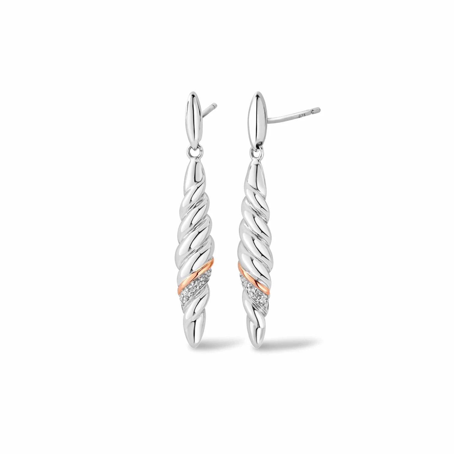 Our Lover’s Twist Drop Earrings romantically symbolise the intimacy of two souls joined together as one. An intricately intertwining body of sterling silver shaped in a classic twist style is embellished with warm 9ct rose gold and the sparkle of white topaz gemstones.