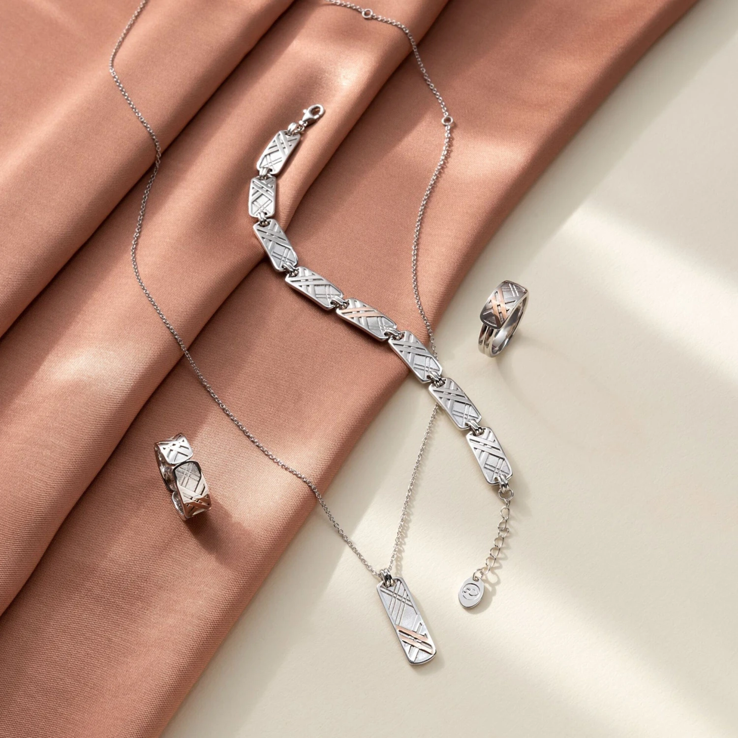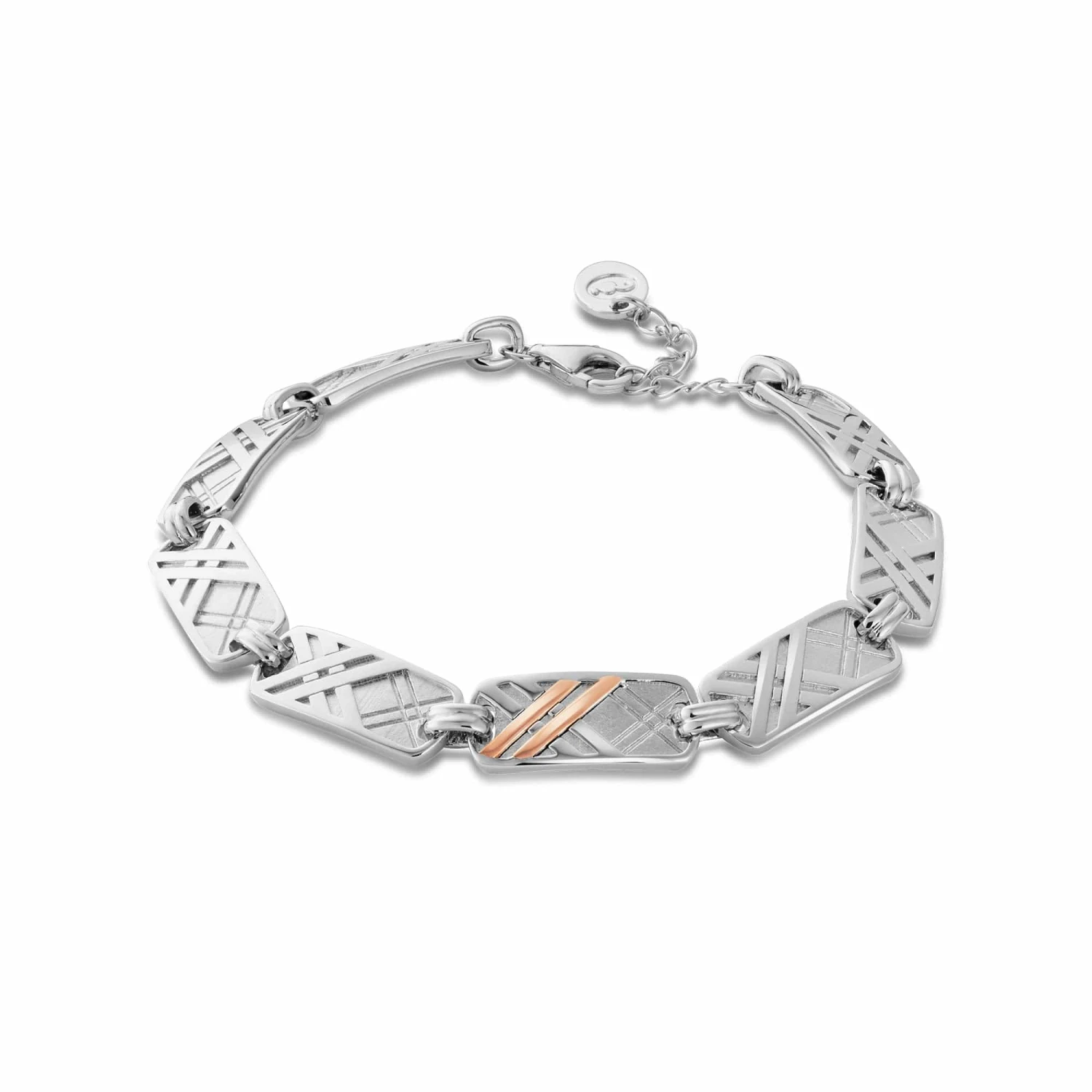 Our traditional Welsh Tartan designs with a modern twist are influenced by the Royal Stuart Tartan – the personal tartan of Queen Elizabeth II. This bold Welsh Tartan Silver Bracelet is crafted from sterling silver and features highlights of 9ct rose gold. Wear to celebrate feelings of belonging or when you want to feel connected to your roots.