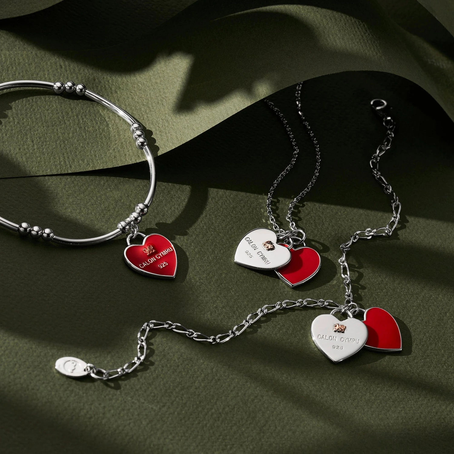Show your passion and pride for the heroes and heroines of the Welsh national rugby teams with our official WRU Welsh Heart Silver Affinity Bracelet, created in partnership with the Welsh Rugby Union. One face of the red enamel heart carries the inscription “Calon Cymru” (“Heart of Wales”), the iconic red dragon in 9ct rose gold, and 925, denoting the use of sterling silver, while the reverse bears an embossed WRU Prince of Wales feathers logo. Stack, layer and build your collection of Affinity bracelets to tell your own unique story through beautiful Clogau jewellery.